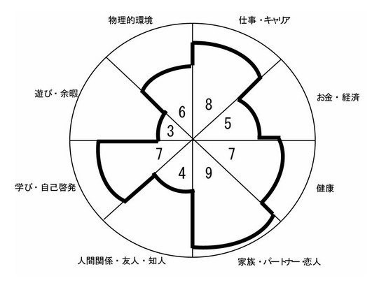 この車輪は現状で、あなたが感じている人生の充実度を表しています。点数の低いところは、あなたが潜在的に充実していない、もしくは、充実させていきたいと認識している領域となります。尺度はあなた自身のため、点数はあなたの価値観で判断してください。